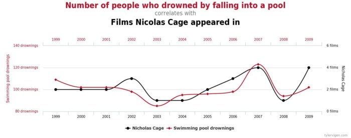 Os pongo otra correlación relacionada: La cantidad de personas que se ahogan en piscinas está directamente relacionado con la cantidad de películas que Nicolas Cage ha hecho en un año determinado. ¿Le decimos al señor Cage que deje de protagonizar películas porque la gente se ahoga en consecuencia?